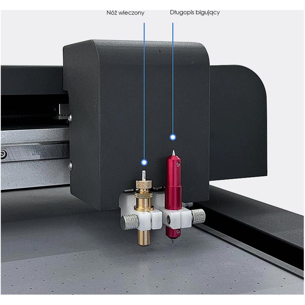 The plotter is equipped with two independent working heads: one with a knife for cutting (full or notching) and the other with a wheel for creasing (kneading the fold line). This allows the full production cycle of packaging - creasing and cutting - to be performed in one process, without the need to change tools.