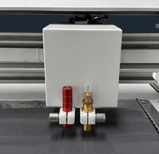 Ploter jest wyposażony w dwie niezależne głowice robocze: jedną z nożem do cięcia (pełne lub do połowy) i drugą z kółkiem do bigowania (wygniatania linii zgięcia). Pozwala to na wykonanie pełnego cyklu produkcyjnego – bigowania i wycinania – w jednym, zautomatyzowanym procesie, bez potrzeby ręcznej zmiany narzędzi.